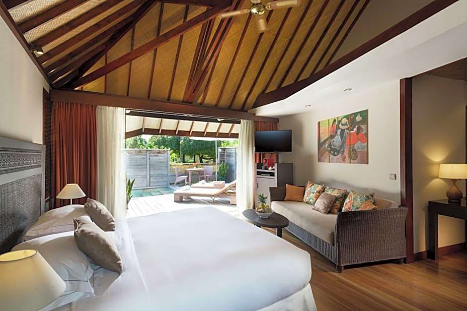 This over water bungalow features picturesque lagoon views of the island. There is a private sun deck with lounge chairs, a table and direct access to the lagoon. Guests can enjoy the array of exotic marine life passing through the glass floor-viewing panels.