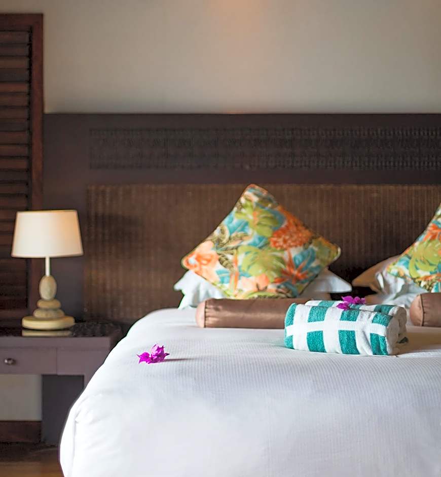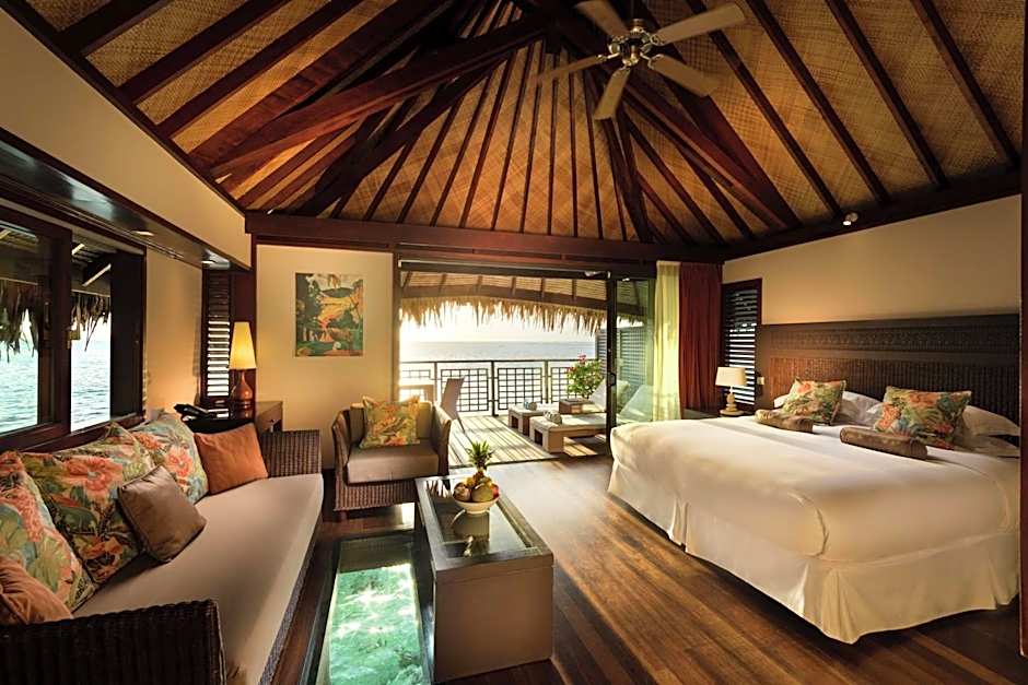This over water bungalow features picturesque lagoon views of the island. There is a private sun deck with lounge chairs, a table and direct access to the lagoon. Guests can enjoy the array of exotic marine life passing through the glass floor-viewing panels.